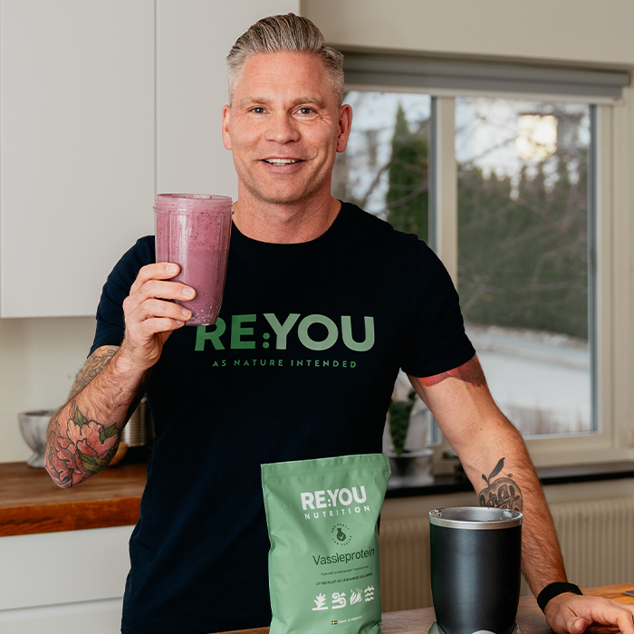 Hvordan Johannes bruker Re:you Protein: Lager ofte en smoothie etter trening med bær og vann.